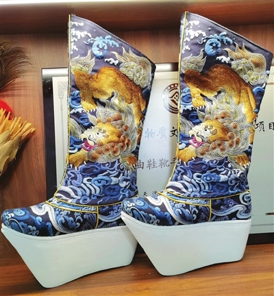 在赵凤彬的创新清单上,最具突破性的莫过于他首创的“分左右脚”戏靴。传统戏靴的鞋帮呈直筒形制,左右脚完全相同,长期存在着“不跟脚”的穿着体验。“武生演员在完成腾空、翻身等高难度动作时,一双不合脚的鞋无疑隐藏着巨大的安全隐患,”赵凤彬边说边拿起新旧两款鞋对比。为此,他大胆重构鞋帮设计,在精准贴合脚型的同时,丝毫不损舞台造型的美感。这一变革,既显著提升了表演者的安全系数,也令赵凤彬成为全国行业内独树一帜的革新者。