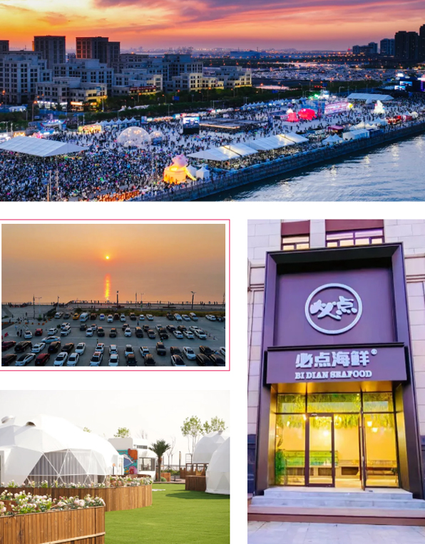 再向北出发,紧靠海岸线的亲海音乐广场,也是各类音乐节的首选场地,适合停下脚步,在海风里聆听一段关于海的旋律。日出东疆·露营基地则为Citywalk增添了一份野趣,不妨在此稍作休憩,躺在露营房感受天津第一缕日出的独特氛围。沿着重庆道走向中交C谷商圈,高楼林立的城市天际线下隐藏着宝藏美食体验,海鲜、咖啡、简餐,也让这趟旅程更添一份从容和闲适。