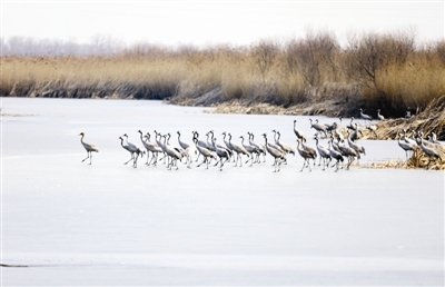 “灰鹤对栖息环境的要求很高,既需要宽阔的活动空间,又离不开水源补给。”韩克武笑着说,冰面上有些不结冰的水域就是灰鹤常常出没的地方。