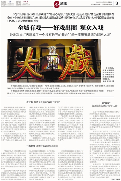 从戏剧到“戏聚”,只要有好戏,必然有观众捧场。记者在现场看到的,是意风区拿起手机仰头拍摄歌剧的孩子,是在中国大戏院楼下为《贵妃醉酒》叫好的年轻人,还有在“大铜钱”和游客一起看话剧《日出》的老街坊……50余万人次线下参与,全网总曝光量突破1亿次,互动量突破1000万次。真正的参与感和热情,来自于一次艺术的创意聚会,也成为大家真正了解天津文化的一次良机。这个双节,天津迎来游客2219万人次,他们走过天津的大街小巷,移步换景,集体走入“人在戏中游”的场景,而这时的他们也成了戏中人——戏聚天津,聚的是好戏,聚的更是人气和神气。