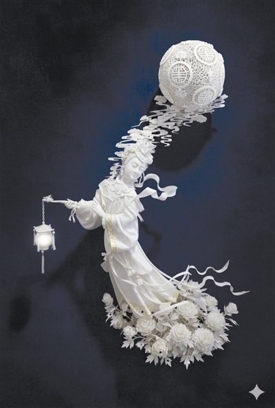 走进常诚的家,客厅俨然一座微型布雕博物馆。人物肖像的肌肤纹理细腻得仿佛能感受到体温,刚“出笼”的螃蟹甲壳泛着油亮光泽,鲜润的瓜果蔬菜似能嗅到清香,纤薄的昆虫翅膀仿佛下一秒就要振翅而飞。若非凑近细看布料的经纬纹理,这些作品极易被误认为是树脂工艺品或3D打印佳作。其中最引人注目的,是一件惊艳的仿牙雕作品《和合织梦》。这件小臂高的作品中,嫦娥衣袂翩跹,玉兔灵动欲跃,牡丹雍容盛放,中心镂空的布雕象牙球最为精妙,灯光透过层层镂刻的布纹透出,整件作品泛着温润如玉的光泽,尽显东方美学的雅致与灵动。