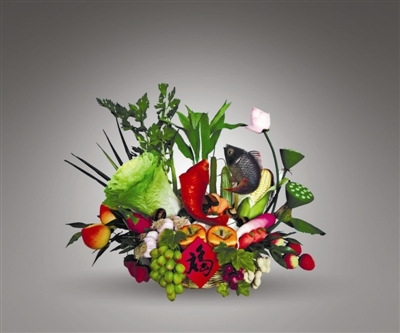 而后,常诚再次以“菜篮子”为主题创作。如今,第四代“菜篮子”里的食材更加丰富多样:鲜嫩欲滴的水果蔬菜、一应俱全的肉鱼蛋奶,还有火龙果、荔枝、菠萝等南方水果。常诚将这件作品命名为“咱家今日的菜篮子”,既体现了如今百姓“菜篮子”满了、“钱袋子”鼓了的幸福生活,也见证了改革开放以来天津人生活水平的巨大提升。