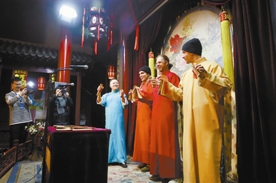 图为国际记者团在老城小梨园·相声茶馆体验天津快板。