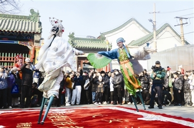 昨日上午,在红桥区西北角特色街区,起源于铃铛阁地区、传承九代的天安寺同乐回族武高跷队演员们身着戏服、脚踩高跷、手持彩杆,为往来游客带来精湛表演,引来阵阵掌声与喝彩。这是“铃铛阁文旅消费嘉年华——马上市集”启幕仪式上的一幕。现场,新疆舞、戏法、快板等特色节目接连上演,市集里,15家商户同步开市,开展福字派送、贴纸趣玩、非遗体验等活动,让游客一站式感受看表演、玩非遗、品美食、购年货的新春乐趣。