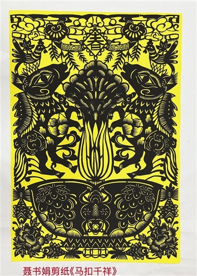 在第二届天津市剪纸艺术精品展上,以马为主题的工艺作品和非遗剪纸让人目不暇接。其中,一幅乡土气息和时代寓意结合的剪纸《马扣千祥》引人注目。