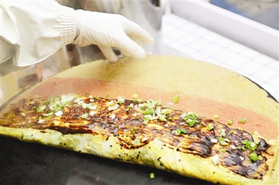做煎饼的大姐舀起一勺绿豆面倒在鏊子上,然后用“竹蜻蜓”沿着鏊子画起了圆形,只是简单的一下,一个又大又圆的煎饼就摊好了,磕鸡蛋、翻面、放馃子、刷酱,一整套流程下来,让排队的刘先生不由自主地咽起了口水。
