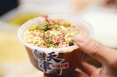 回旭的茶汤手艺,源于家族的世代传承。“我爷爷是勤行出身,父亲也干这行,虽断断续续,但这手艺一直没丢,到我这儿已是第四代了。”他介绍说,茶汤的制作看似简单,却藏着老祖宗传下的讲究,用传统秫米面加入热水搅拌均匀,再搭配白糖、红糖、芝麻、花生、葡萄干等配料。而这配料的演变,正是一部微型的生活变迁史。“最早码头文化盛行时,物资匮乏,茶汤配料只有红糖、秫米面和青红丝这三样。”回旭回忆说,后来生活条件好转,配料逐渐丰富,芝麻、花生、葡萄干等成了标配,这在当时已是不小的“创新”。如今,为了迎合现代人对口感和营养的需求,在配料中加入了腰果、巴旦木等,口感更丰富、营养更均衡,深受顾客喜爱。