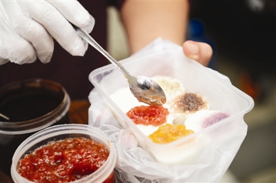 熟梨糕是天津最具代表性的食物之一,不仅藏着天津市民的儿时记忆,也是大多数外地游客来津品尝美食的必吃品。谈及产品,马小龙介绍说店里有几类东西是常年必备的,受季节限制无法全年采购新鲜的红果,他会提前储存,确保随时为顾客提供。