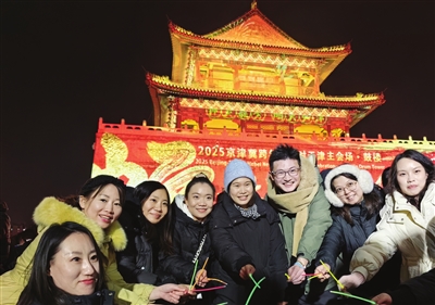以墙为幕,投射发展成就,寄望美好新年;鼓楼钟声,旧岁余韵不绝,敲响有为新章;三地同庆,融合文旅资源,共创协同发展。昨晚,2025天津“鼓楼津声”跨年系列活动在南开区鼓楼广场举行,炫目的灯光秀与夜景演出轮番上演,共庆新年到来。同时,今年也是京津冀三地首次联动举办跨年活动,北京首钢园、天津鼓楼广场和河北正定古城三地会场携手同庆迎新年,用直播互动形式寄语新春,传递祝福,共谱美好明天。