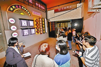 “国庆游艺会”以“立体City Walk”形式,引导观众漫步于这座艺术殿堂。观众不仅可以在街头仰望阳台上水袖翩跹的戏曲表演,还可以步入戏院参观情境式展览《名伶之路》,在“科班”“戏台”“流派起津门”等主题场景中追溯梨园往事。展览集中呈现1936年投入使用的第一代奥的斯电梯、梅兰芳先生使用过的梳妆台等多件珍贵院藏文物,这一创新设计打破了静态观展模式,让观众在方寸之间感受天津作为“戏曲大码头”的深厚底蕴。