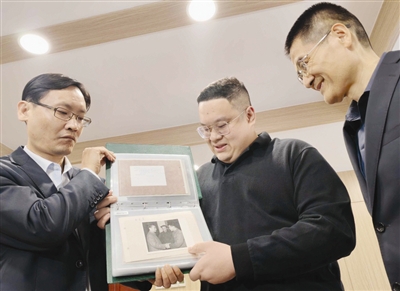 黄子潇(中)向周恩来邓颖超纪念馆捐赠珍贵照片