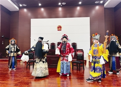 活动现场,天津京剧院名家、著名女花脸刘嘉欣,携手剧院老旦演员史绍跃、文武老生演员王帅军,精彩演绎经典“包公戏”《赤桑镇》与《铡美案》选段。刘嘉欣告诉记者,这是她首次在“模拟法庭”场景中演绎刚正不阿的包青天。“今天的演出,借助舞台调度与场景设计融入新颖表现形式,既展现了京剧舞台上包公廉洁奉公的经典形象,也让我更深刻地体悟到其在当下的社会价值。”
