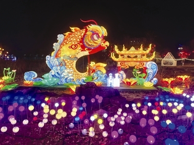在京剧脸谱造型的大型花灯前,有一个用红毯包裹的圆台,旁边的花瓣造型上还有一个侧面补光灯,只要站在圆台上拍照,面部和花灯都可以清晰呈现,这就是今年灯会给游人的意外惊喜。为了解决夜间拍照“灯亮人黑”的痛点,今年特意在多数灯组的最佳打卡点装上了补光灯,并且设置了醒目的拍照点位,游客轻松就能拍出质感大片。“这个设置在大型的灯组旁边都有,能让游客有更好的体验。”王磊说。