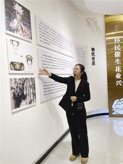 说起背诵讲解词的秘诀,李丹收起笑容认真分享:“哪能死记硬背?我会先把展厅20多个点位,按历史脉络串成思维导图,每个节点都挖透背后的故事。”她指了指墙上的老照片继续说,“比如我听老师傅们讲,早年间曹子里人推着独轮车,把绢花卖到北京、天津的庙会,走一路卖一路;上世纪80年代,村里家家户户都做绢花,晚上路灯下全是做绢花的人。这些老故事,都是我的‘秘密素材’。”