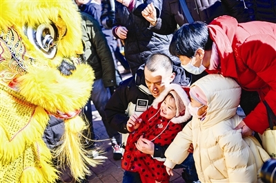伴随着铿锵的锣鼓,点睛的雄狮腾跃起舞。爸爸怀里的两岁半妮妮,一边跟着节奏扭动身体,一边兴奋地拍着小手,笑声不断。8岁的哥哥则被不远处的糖人摊吸引,拉着妈妈问:“市集开了,我能去画个糖人吗?”