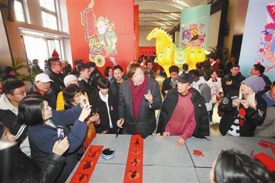 从博物馆门前的青藤小路望去,各式彩灯高悬,诗词佳句引得大家轻声吟诵。走进大爱厅,昂扬奋蹄的马形彩灯旁,立着两对传统门神。“这年味儿,真是扑面而来。”来自俄罗斯的一名留学生赞叹道。大厅大屏幕上讲述了春联的平仄知识,写福字的老师在一旁介绍,一笔福字,讲究“多子、多才(财)、多田、多寿、多福”的“五福合一”。