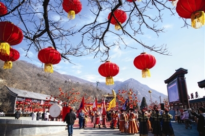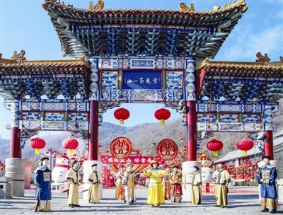 马年新春大年初一,盘山风景名胜区入胜山门广场张灯结彩、锣鼓喧天,“福满盘山·冰雪奇缘”2026盘山春节游园会正式启幕。