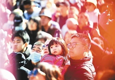 从大年初一开始的曲艺演出,在昨日还迎来不少“返场游客”。来自石家庄的张先生在前一天没过够瘾,上午10点就早早地在亲水平台“占座”。他挺喜欢化妆相声《参军戏》,家里的小小子则对音乐快板特别感兴趣,还和着节奏鼓掌。