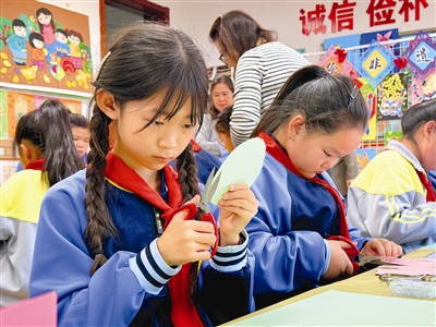 这堂课的“主教室”设在天津市河头学校,远在甘肃省华池县的乔川九年制学校的同学通过大屏幕“来到”了同一个课堂,共同开展“山海绘影・津甘同心”非遗交流活动。孩子们亲手剪制并组装出夸父、精卫等神话形象,让上古神兽在指尖“活”起来。