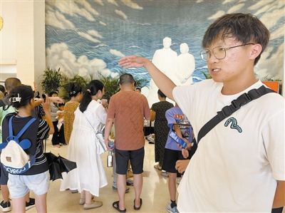 在古文化街戏楼旁,导游刘楠向游客们介绍着这里的民俗文化。这是她担任地接导游的第16个年头,同样也是她经历的第16个酷热难耐的暑期。