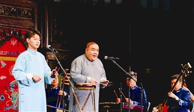 在第五届宣南杯鼓曲大赛天津站展演上,任洽(左)与师父张博对唱金派梅花大鼓新作《半生思念》。