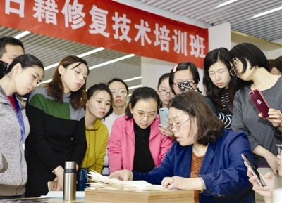 自2015年以来,万群以天津图书馆为“圆点”,不间断地在南开大学、陕西省图书馆的古籍修复传习所带徒授业,已经培养出21位徒弟,其中一部分徒弟已成长为新的传习导师,她在天津图书馆的徒弟,更成为可以独挑大梁的青年古籍修复专家。