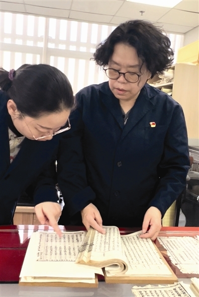 万群(右)和徒弟张榕榕在研究古籍修复 摄影 记者 曹彤