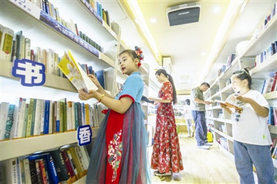 “行走的假日图书馆”开进水上公园。记者 曹彤 摄